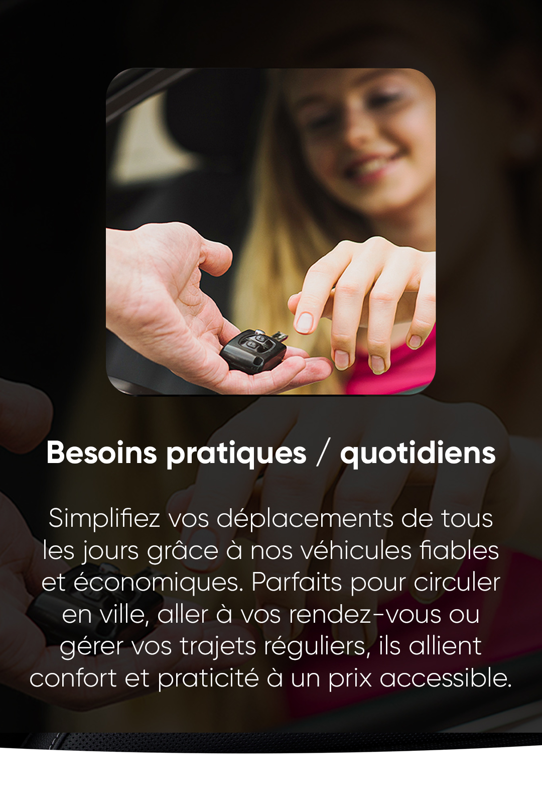 Simplifiez vos déplacements de tous les jours grâce à nos véhicules fiables et économiques. Parfaits pour circuler en ville, aller à vos rendez-vous ou gérer vos trajets réguliers, ils allient confort et praticité à un prix accessible.