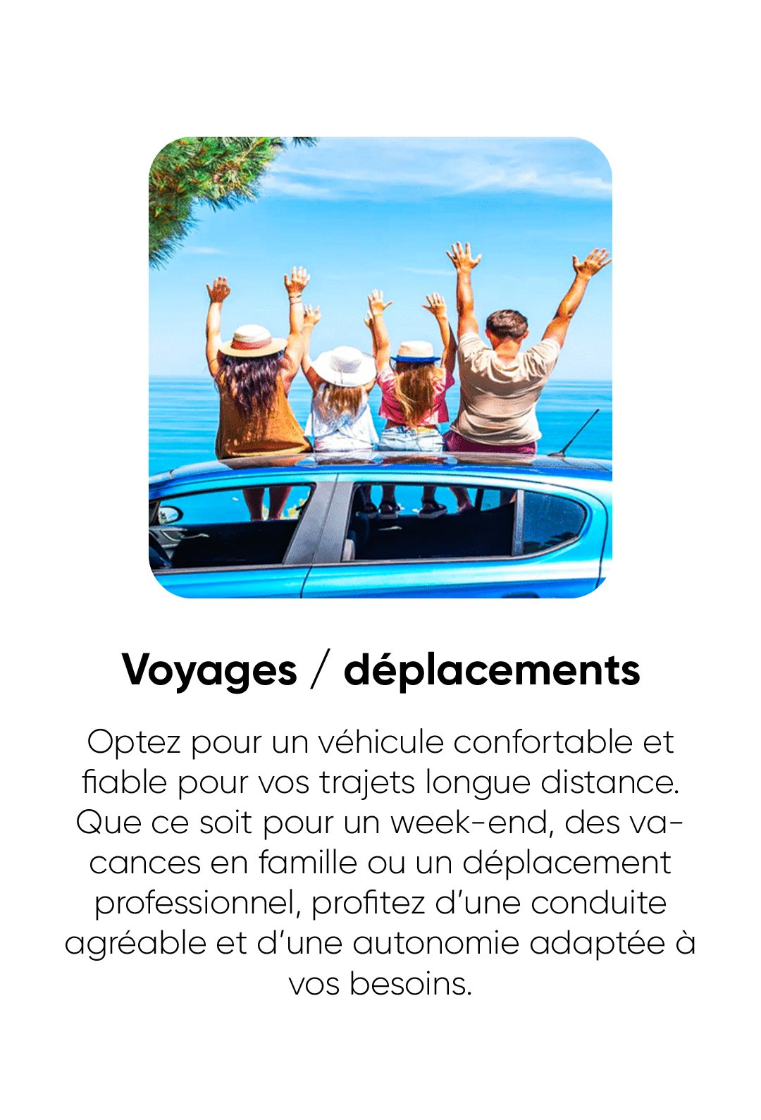 Optez pour un véhicule confortable et fiable pour vos trajets longue distance. Que ce soit pour un week-end, des vacances en famille ou un déplacement professionnel, profitez d’une conduite agréable et d’une autonomie adaptée à vos besoins.