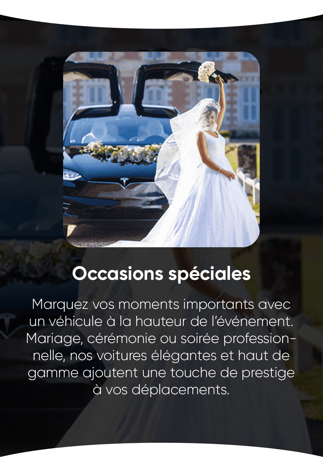 Marquez vos moments importants avec un véhicule à la hauteur de l’événement. Mariage, cérémonie ou soirée professionnelle, nos voitures élégantes et haut de gamme ajoutent une touche de prestige à vos déplacements.